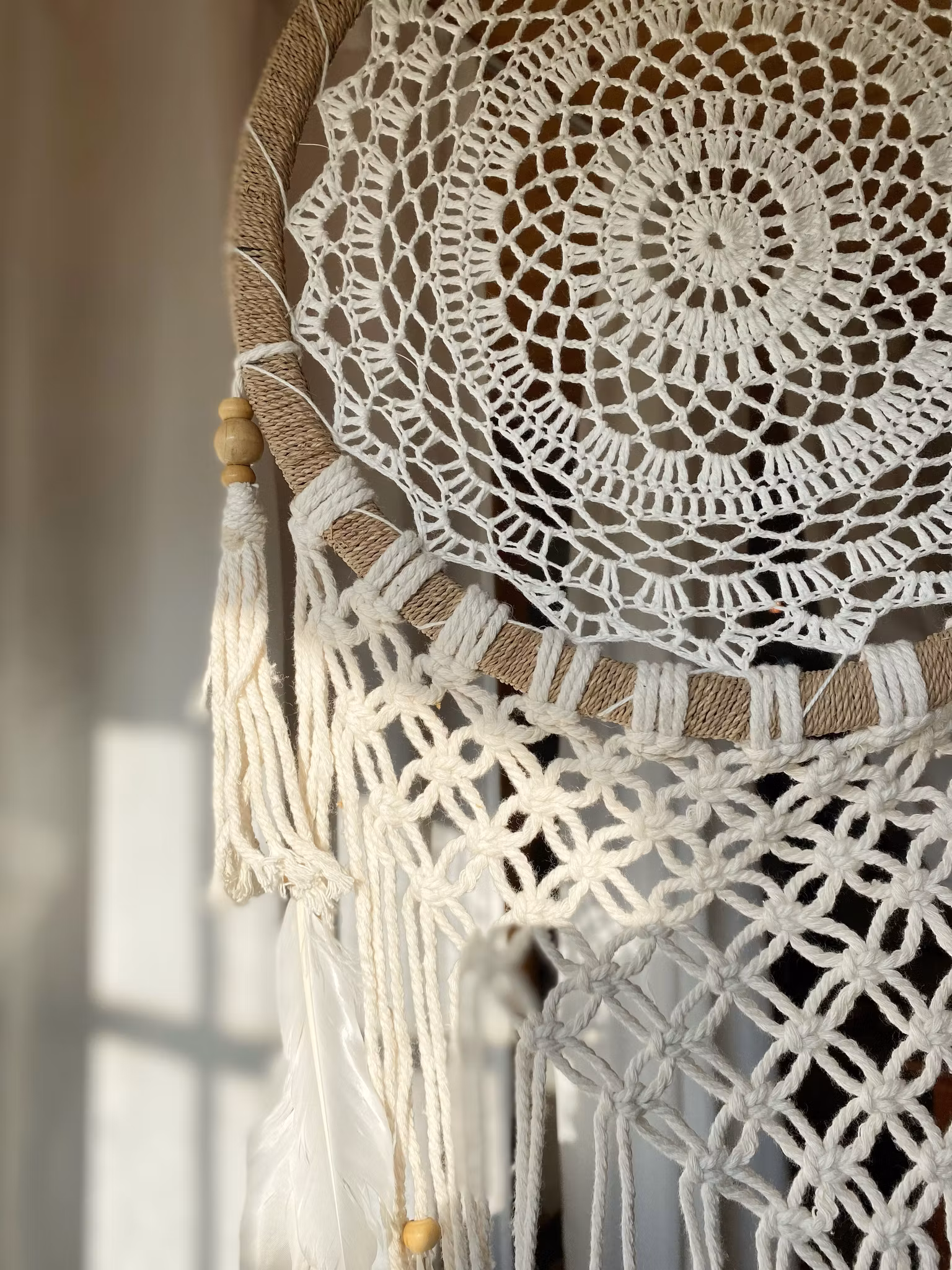 Finns i lager! Drömfångare med träpärlor och makramé 398:- Lägg i korgen Artikelnummer: 58 Drömfångare med makramé, fjädrar och träpärlor. Ringen är tvinnad med tråd i naturmaterial.Längd 110cm. Diameter på ringen är 32cm.Handgjord med kärlek på Bali.