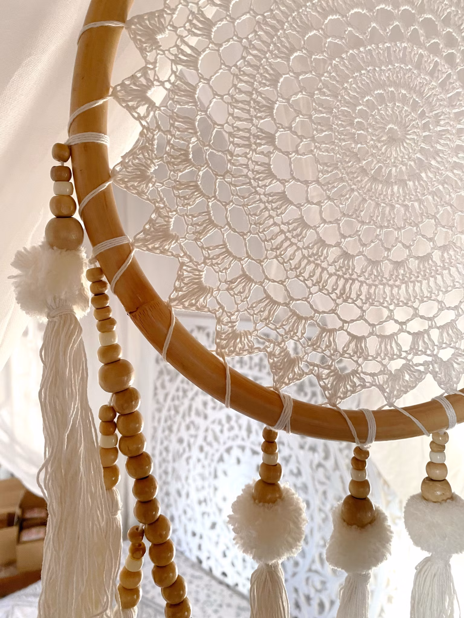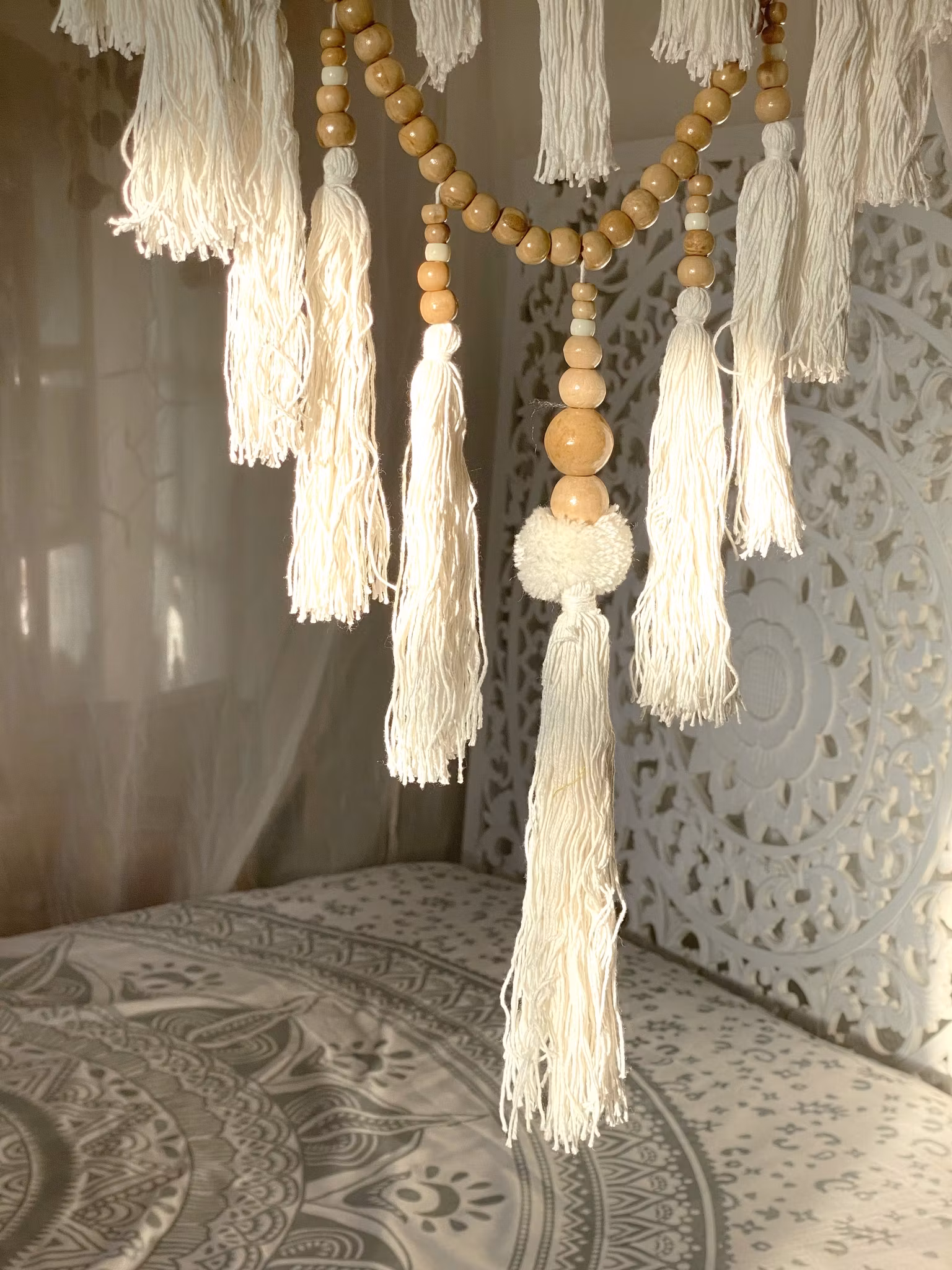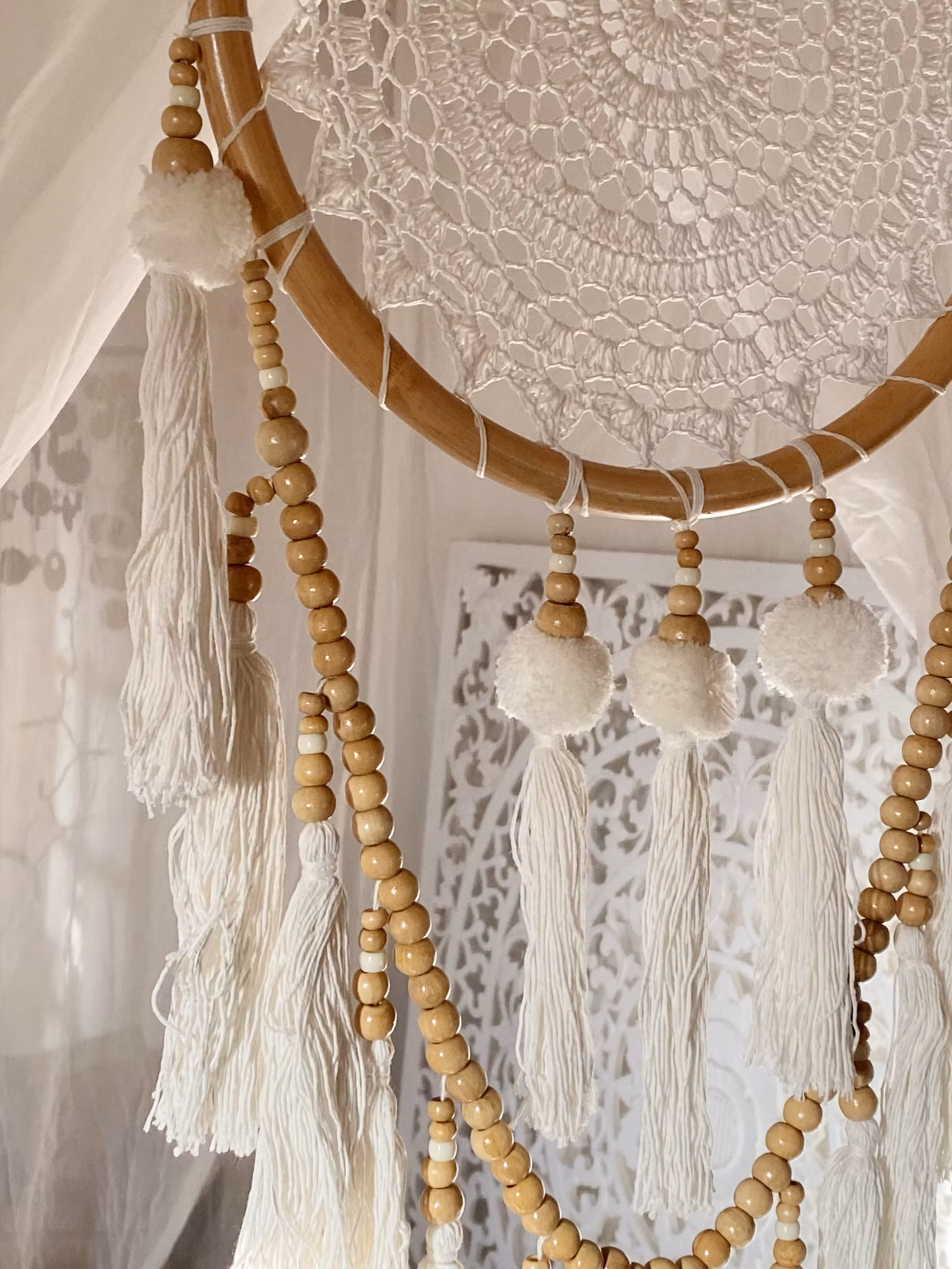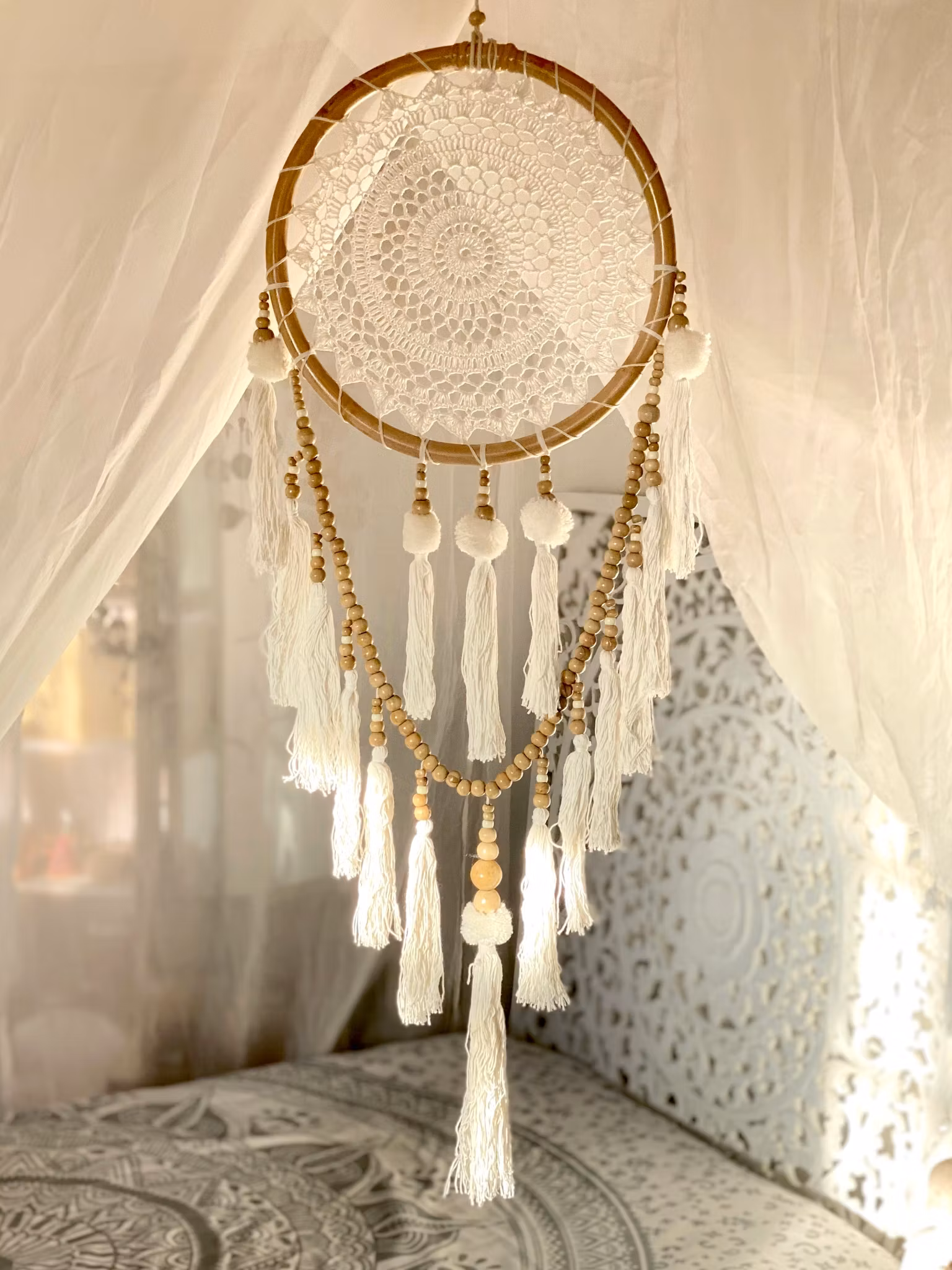 Finns i lager! Drömfångare med träpärlor och tofsar 498:- Lägg i korgen Artikelnummer: 117 Drömfångare utan fjädrar med träpärlor, tofsar och detaljer i makramé.Diameter är 32cm.Handgjord med kärlek på Bali ♡