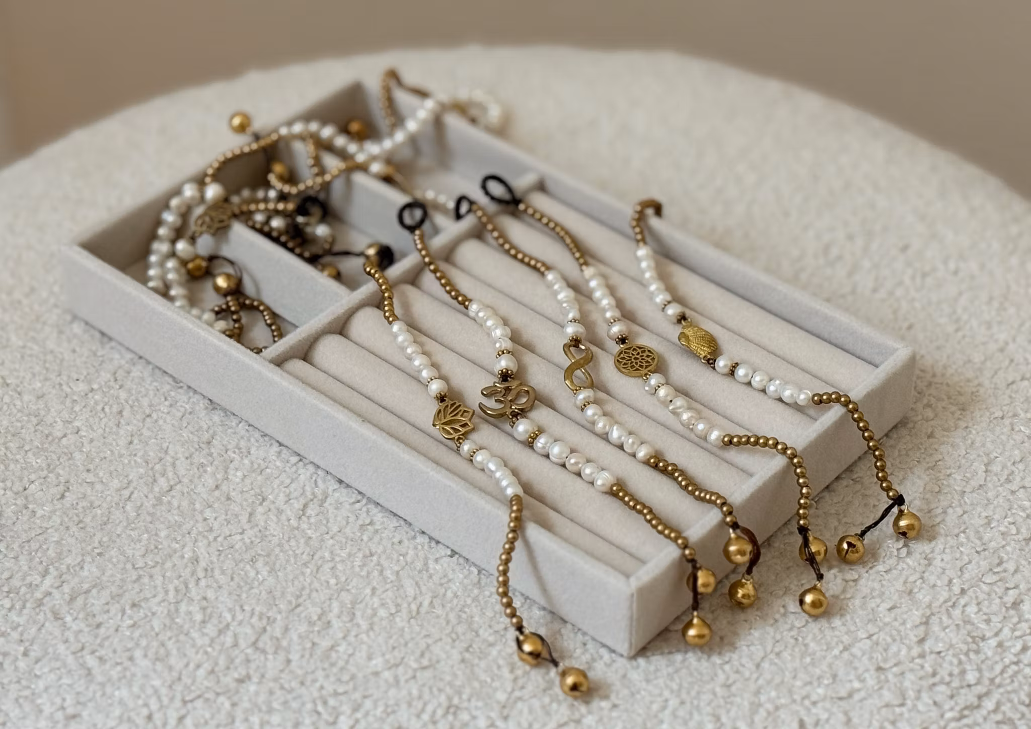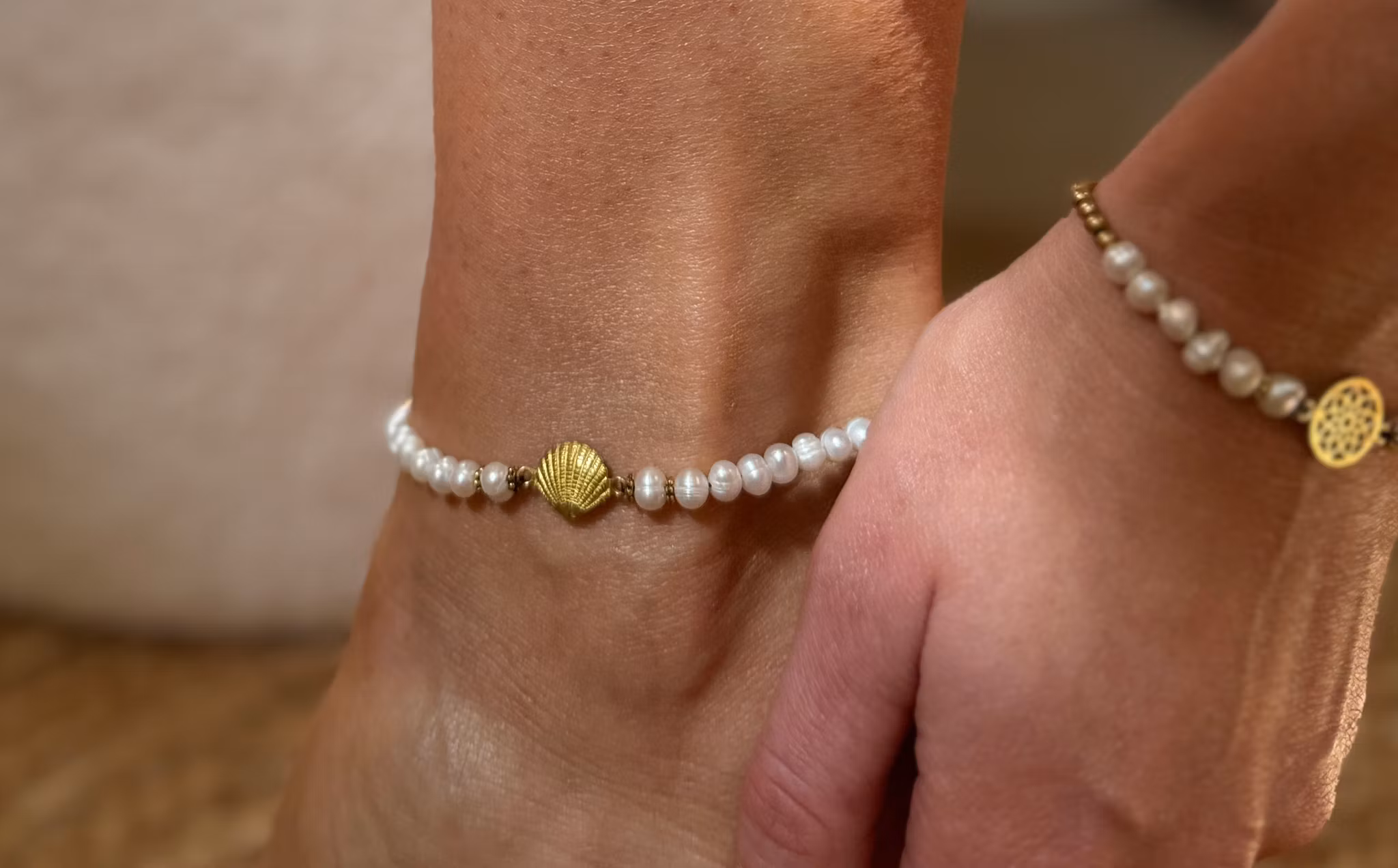 Finns i lager! Fotlänk med sötvattenspärlor, mässing och snäcka 169:- Lägg i korgen Artikelnummer: ANK7012-SH Justerbar fotlänk med sötvattenspärlor, mässing och en snäcka.Handgjord med kärlek på Bali ♡
