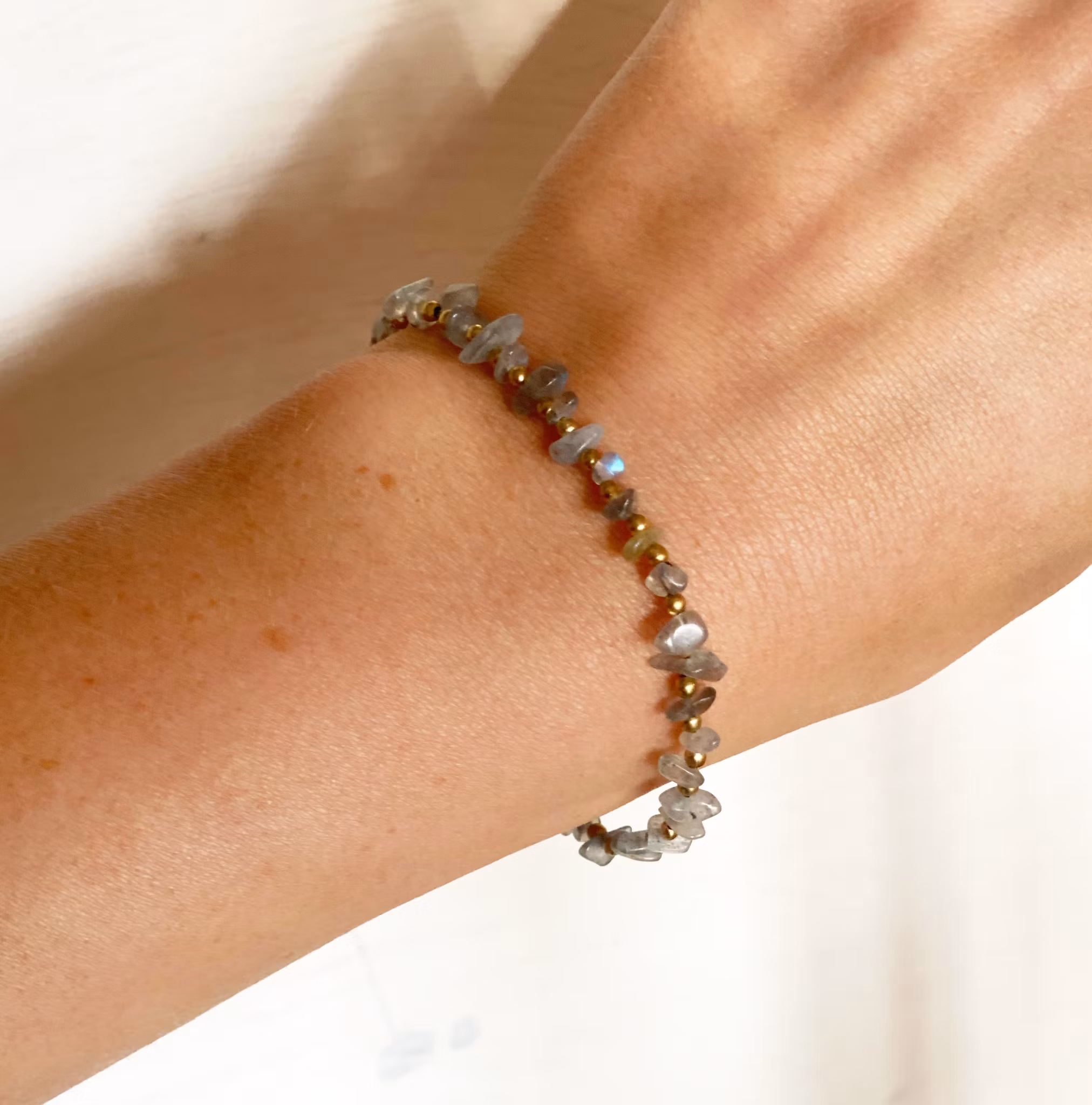 Underbart silver och blå skimrande armband med grå labadorit och små pärlor av mässing. Möjligt att ställa in i två storlekar.