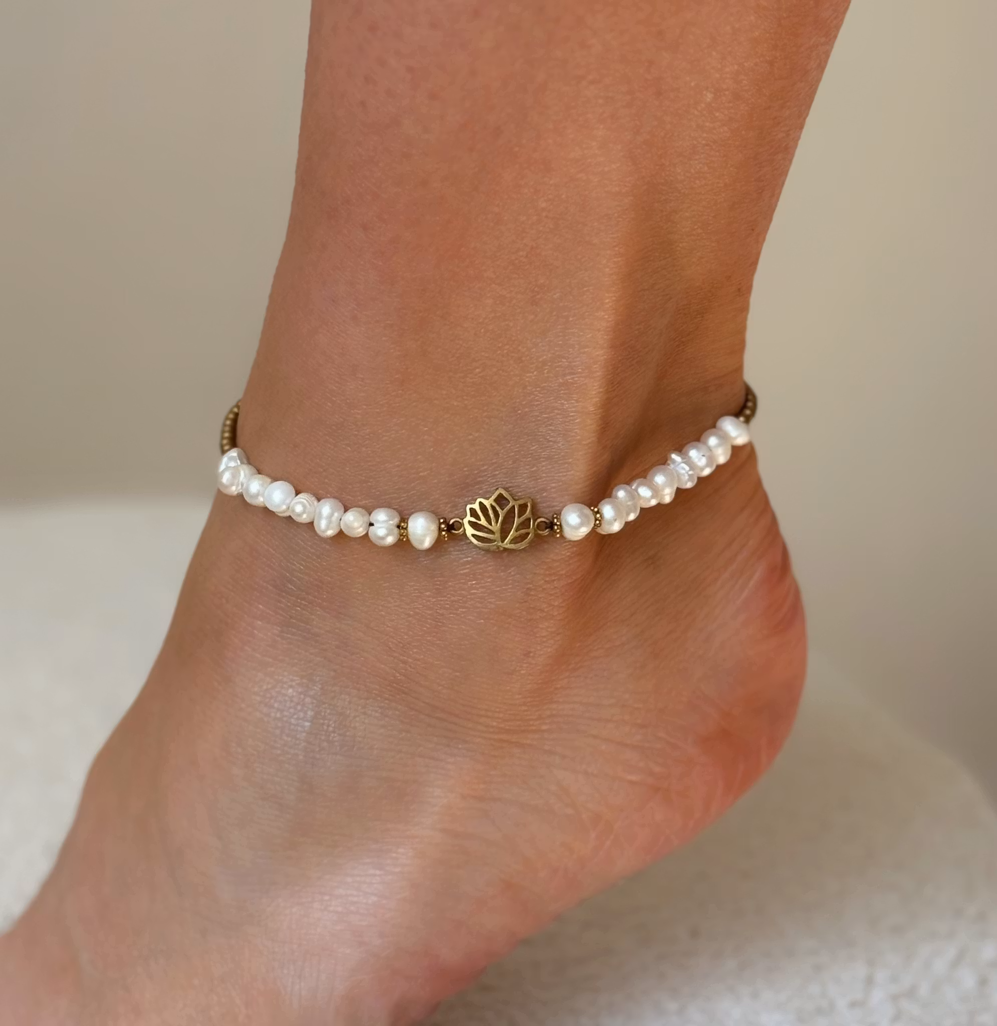 Justerbar fotlänk med sötvattenspärlor, mässing och en lotusblomma.