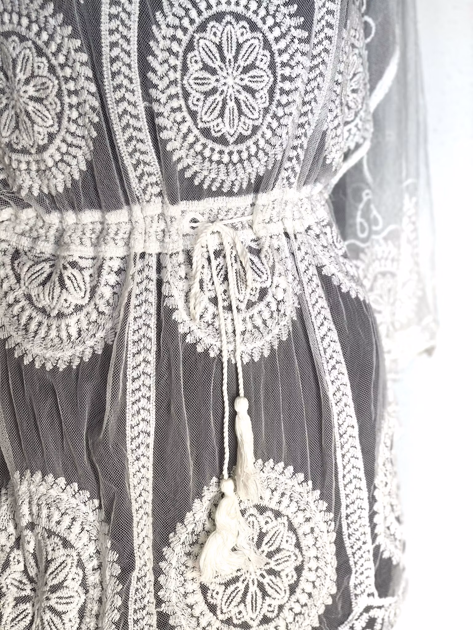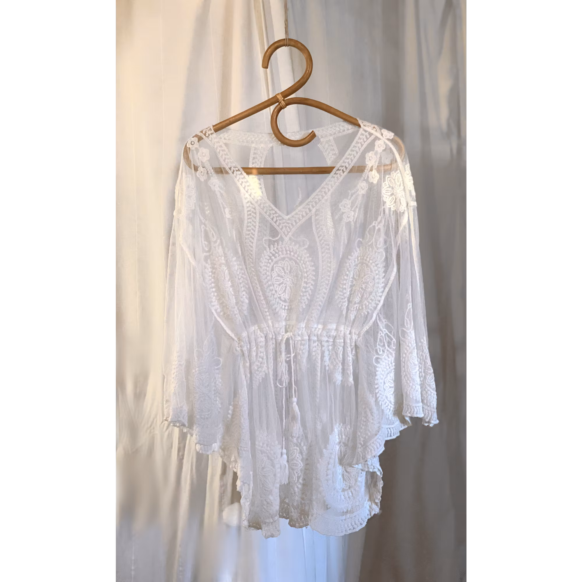 Underbar blus med en smickrande dragsko i midjan med tofsar.