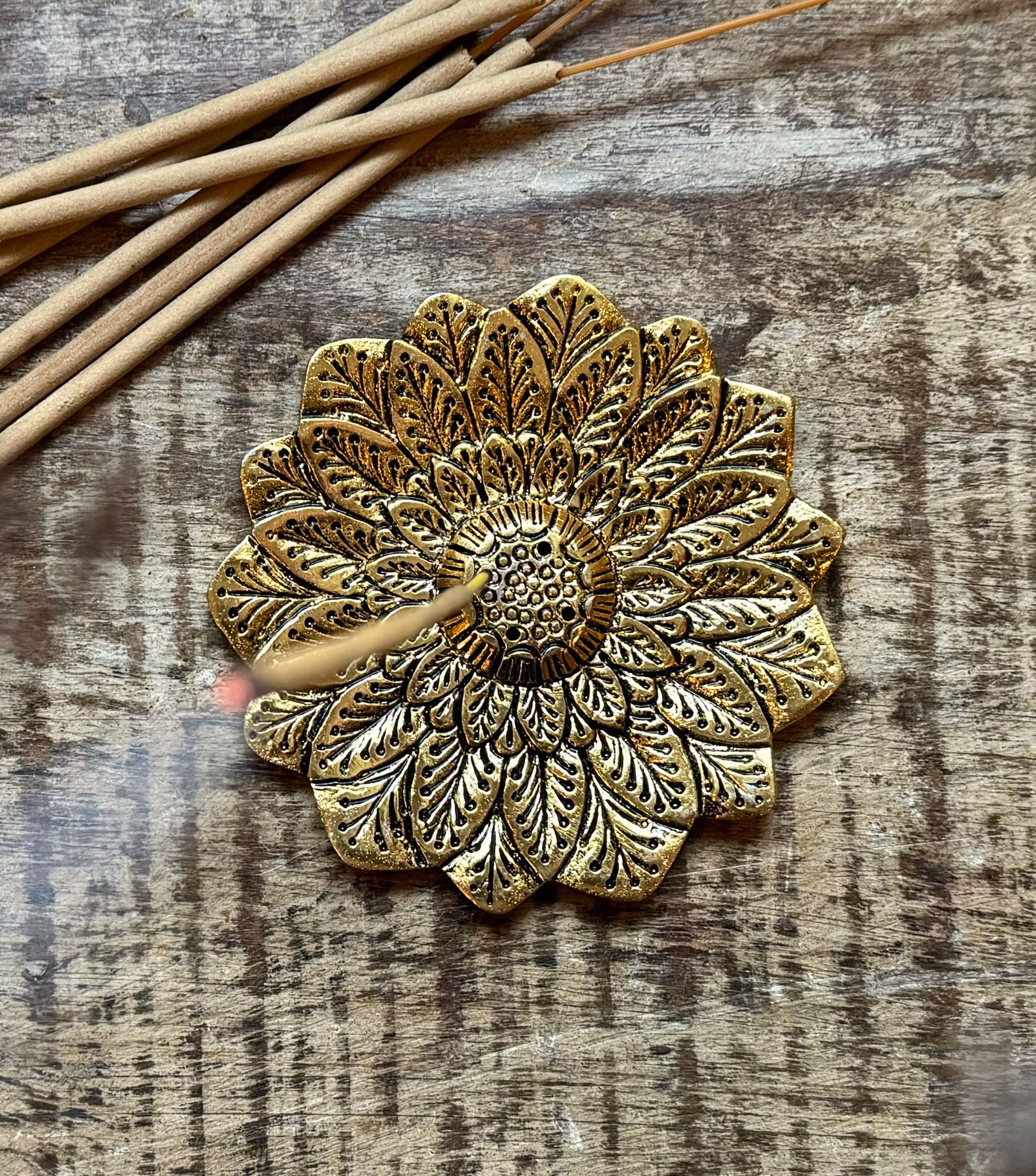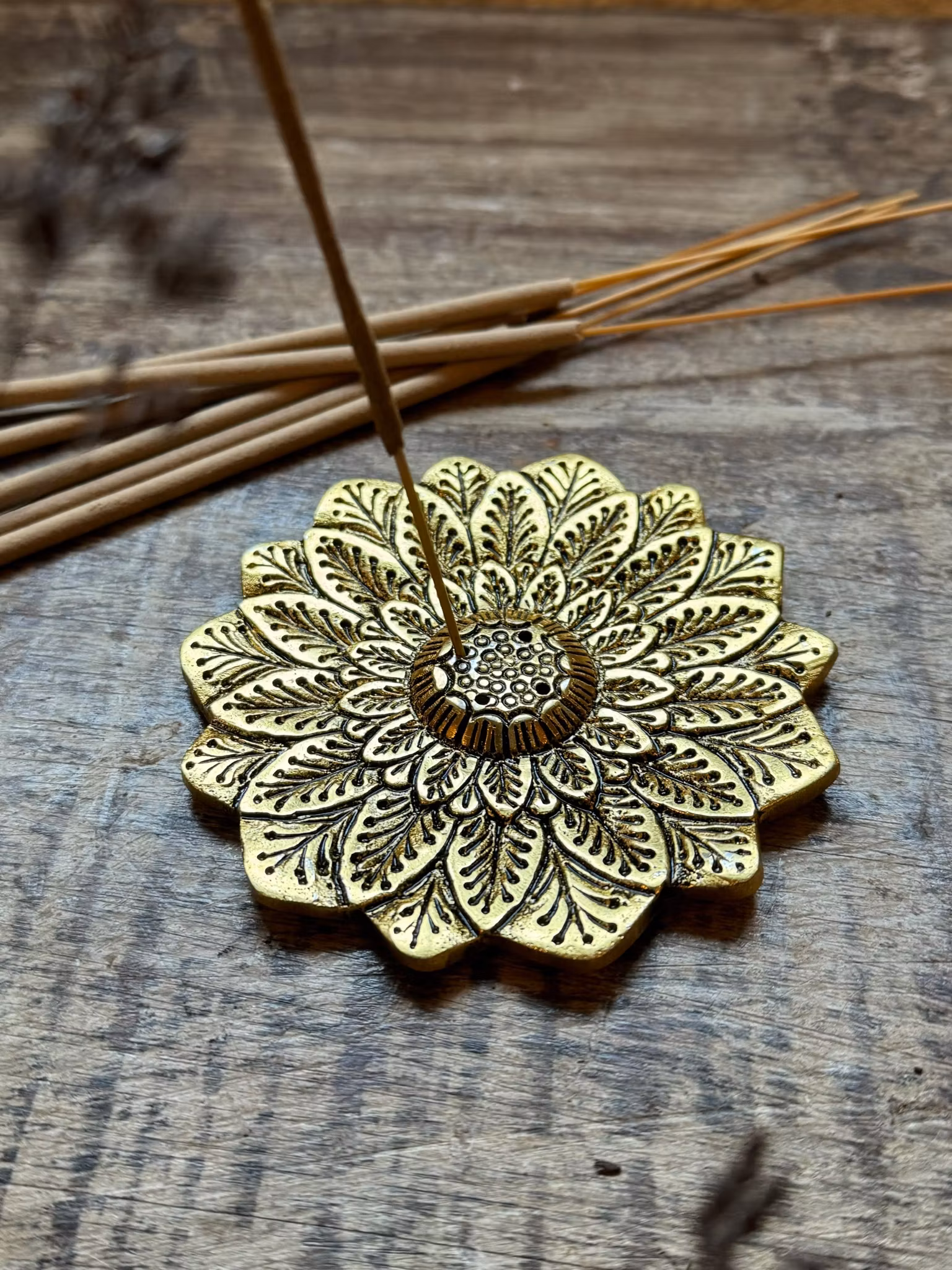 Finns i lager! Lotus rökelsehållare fat guld 120:- Lägg i korgen Artikelnummer: 518 Lotus fat till rökelser. Du kan ha fyra rökelser i på samma gång.Fatet är 11cm i diameter och tillverkat i Indien.