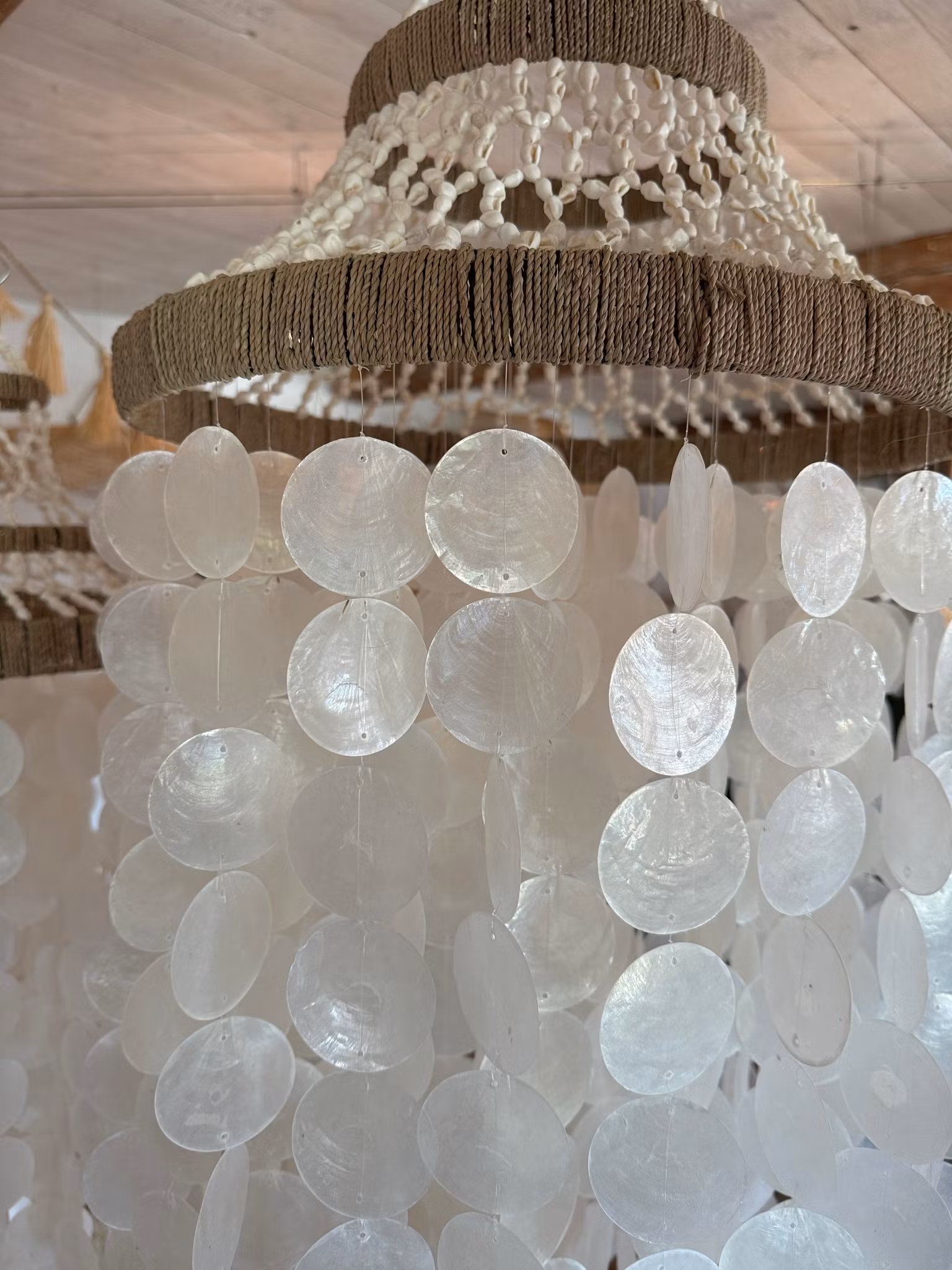 Underbar, handgjord snäckskalslampa! Små snäckor i makramé mönster på toppen och capiz snäckskal i fisketråd från en metallram. Lika vacker med belysning i som utan!